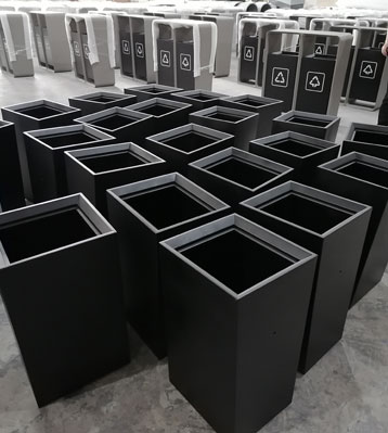 顏色按福田城市形象更新戶外桶通用顏色,采用無縫一體化可回收物和其他垃圾2分類設計制作。框架1.5mm加厚不銹鋼噴塑戶外防銹耐用,搖擺桶顏色和里面內桶的顏色砂紋黑色,里面內筒不銹鋼0.8mm厚噴塑防銹升級。煙盅為不銹鋼2.75mm和1.0mm厚度噴塑,帶磁吸鎖,絲印深圳福田形象福字LOGO。全新設計單手拉動傾斜桶身完成換袋,簡化環衛工收運流程。